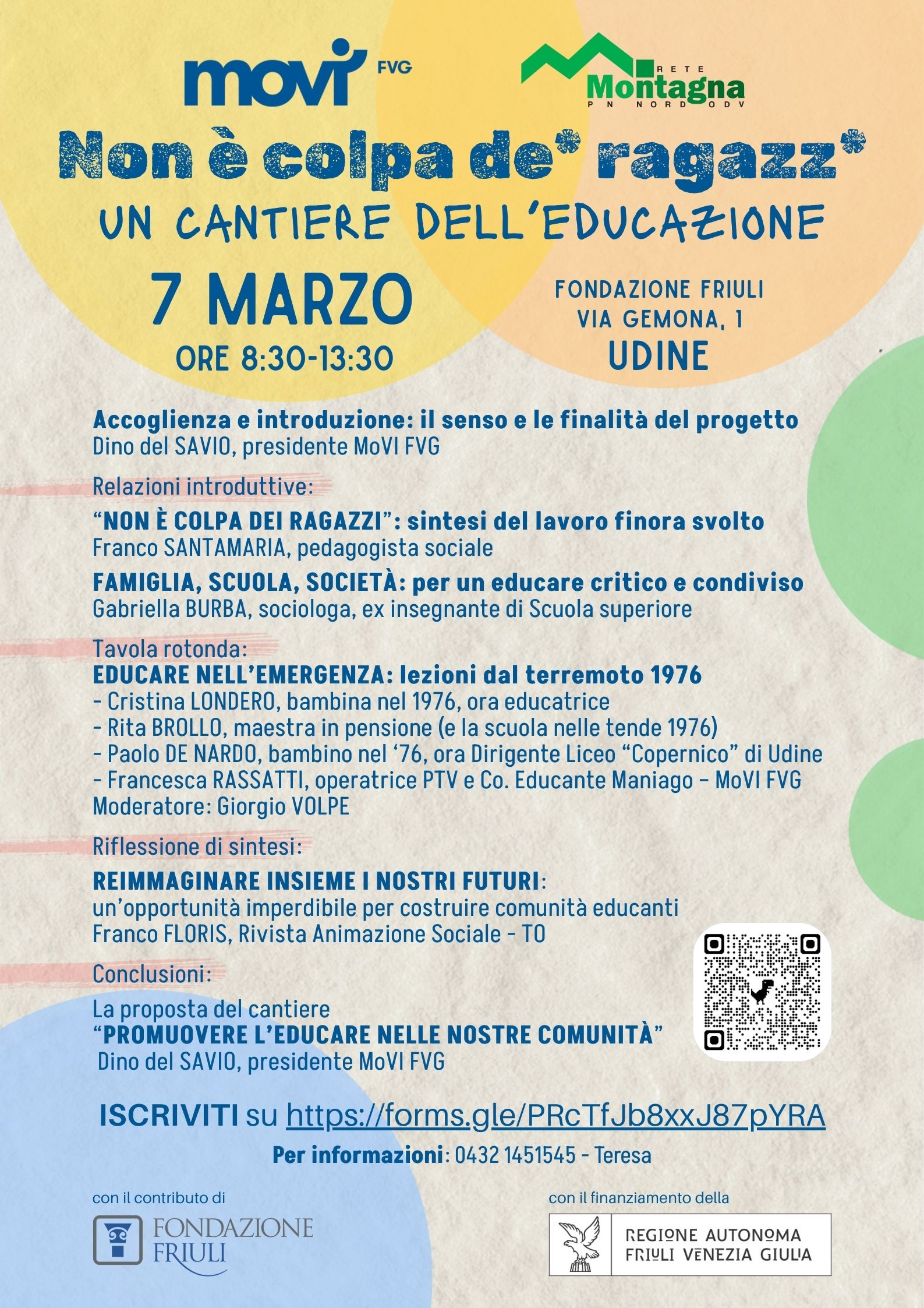 Il convegno “NON È COLPA DE* RAGAZZ*: un cantiere dell'educazione” rappresenta il secondo appuntamento del progetto “Si impara facendo” e nasce con l’intento di condividere le riflessioni maturate da realtà pubbliche e del Terzo Settore nel lavoro educativo con giovani in condizione di fragilità. Il confronto si concentrerà sulla costruzione di una vera comunità educante, capace di far dialogare la scuola con le risorse del territorio, approfondendo al contempo l’eredità della pedagogia legata alla catastrofe del terremoto come modello di resilienza e ricostruzione sociale per le nuove generazioni.Sarà un momento importante per condividere le riflessioni maturate nel lavoro educativo con giovani in condizione di fragilità e per riflettere insieme sulla costruzione di una vera comunità educante capace di far dialogare la scuola con le risorse del territorio, approfondendo al contempo l’eredità della pedagogia legata alla catastrofe del terremoto come modello di resilienza e ricostruzione sociale per le nuove generazioni. per iscriversi scarica locandina