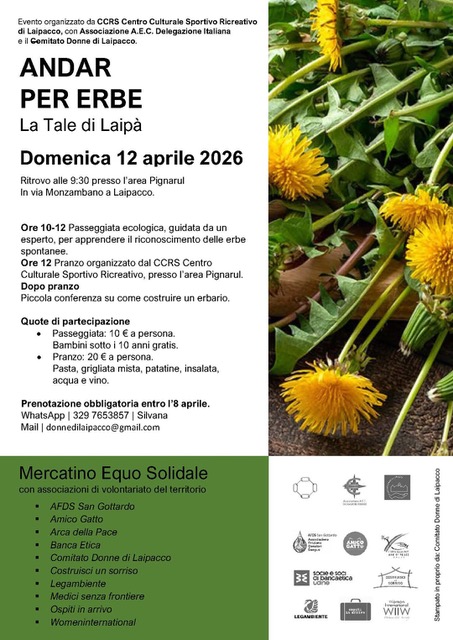 Il Circolo Legambiente Udine A.P.S. aderisce e partecipa al " Mercatino solidale" organizzato dal Comitato Donne di Laipacco e invita a questa festa alcune associazioni del territorio che operano nel volontariato e saranno presenti anche le Associazioni di Laipacco , in un’ottica di confronto e collaborazione. Ci sarà la possibukità di partecipare alla passeggiata guidata da un esperto per il riconoscimento delle erbe di campo scarica locandina