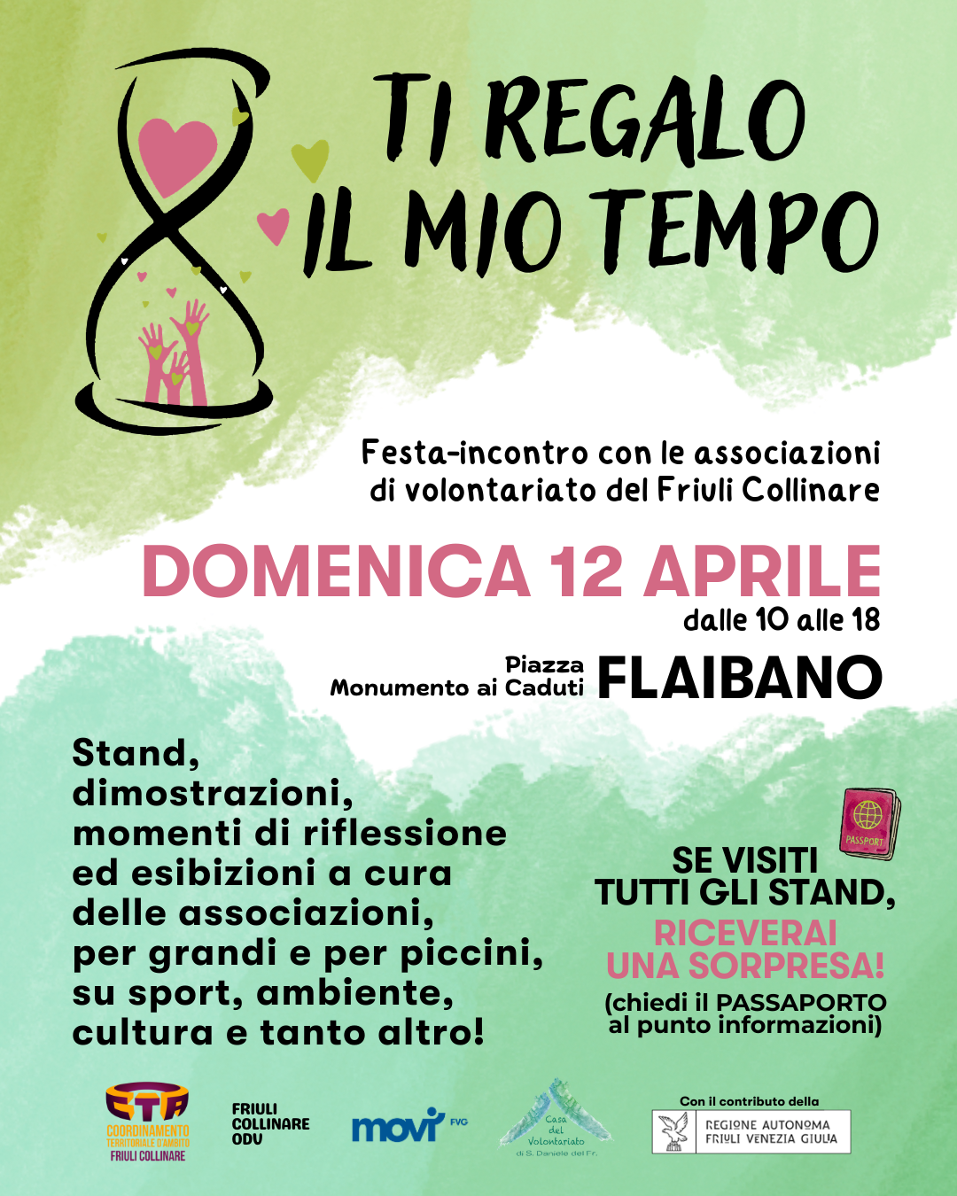 Anche quest'anno, domenica 12 aprile al fianco dell'iniziativa delle proloco del Friuli Collinare, sarà presente "Ti regalo il mio tempo", festa del volontariato organizzata dal Coordinamento delle associazioni del Friuli Collinare. Proporranno a grandi e piccini giochi, sfide, laboratori per conoscere il mondo della solidarietà e dell'impegno civico che è un ingrediente importante per il "biel vivi" nel nostro territorio, possibile anche grazie al contributo di moltissimi cittadini che dedicano la propria passione e il proprio tempo a rendere migliore il mondo che ci circonda. scarica locandina e programma