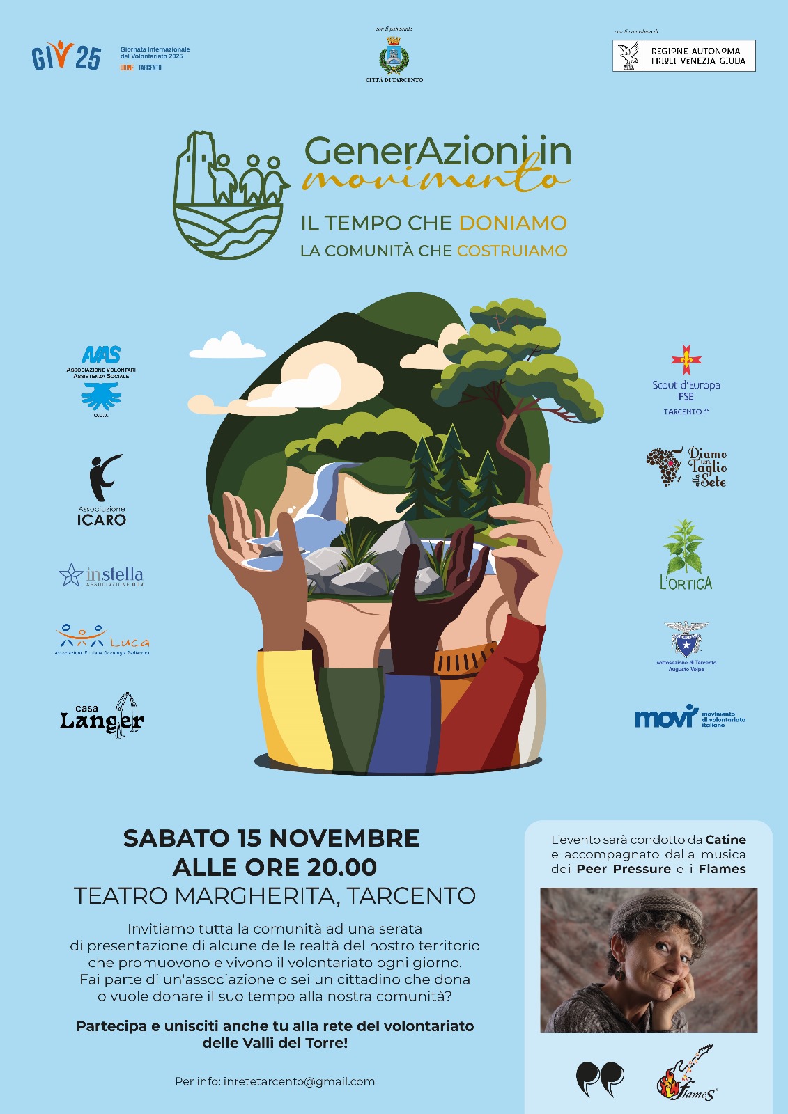 Nell'ambito del progetti GIV25 la comunità di Tarcento e delle Valli del Torre! organizzano ed invitano alla serata dedicata al volontariato. Serata di presentazione di alcune delle realtà del territorio che vivono il volontariato ogni giorno. Un evento teatro-musicale per rafforzare la rete solidale. "Il Tempo che Doniamo, la Comunità che Costruiamo". Se fai parte di un'associazione o sei un cittadino che desidera donare